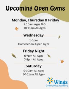 We are excited to announce that Wings Β is launching Homeschool Open Gyms on Wednesdays starting October 1st! Β This 2 hour open gym will be $12 for ages 2+ and $2 for ages 6-23 months. Β Family Punch Passes are available and include a FREE Open Gym. Β So you get 11 punches for $120 instead of 10!